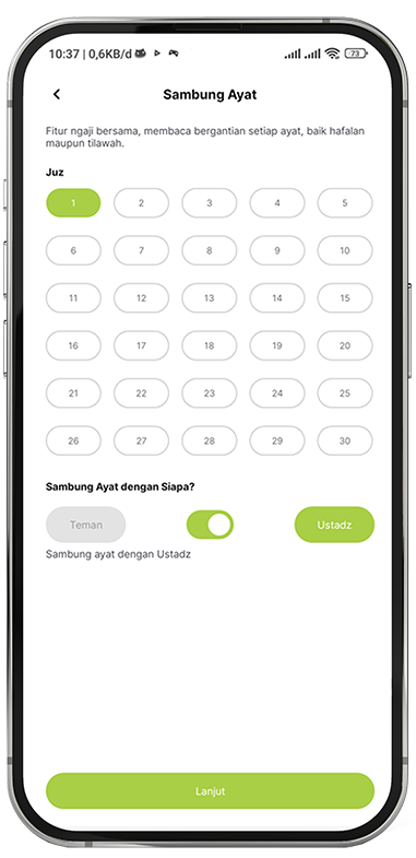 Layanan ngaji bersama, membaca bergantian setiap ayat, baik hafalan maupun tilawah. Fitur ini dapat dilakukan dengan sesama peserta ataupun dengan ustadz/ah.