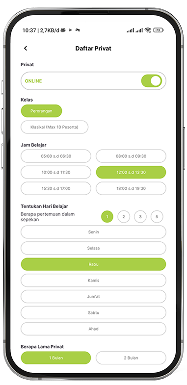 Layanan pendaftaran untuk pembelajaran secara rutin dengan satu ustadz/ah tertentu. Peserta dapat menentukan waktu belajar dan sistem belajar yang dinginkan, bisa online ataupun offline.